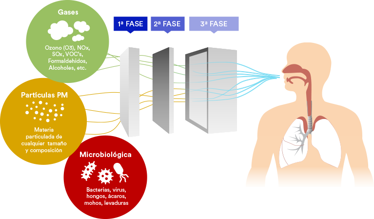 Un filtro exclusivo desarrollado por ZONAIR3D con el que se obtiene una reducción de los gases tóxicos procedentes del exterior y gases tóxicos del interior generados por materiales de construcción, pinturas, etc.
